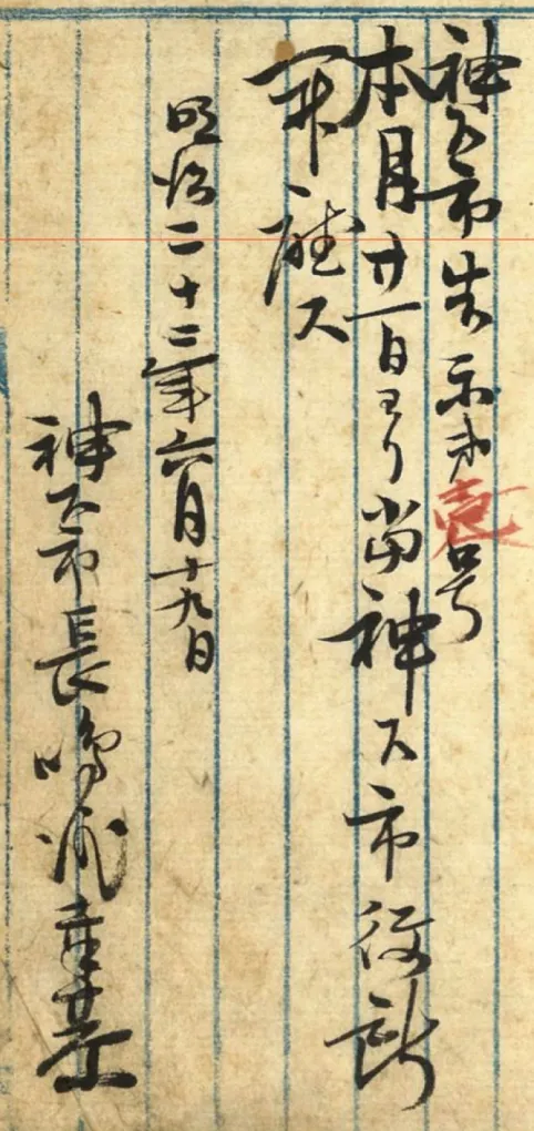 記念すべき「神戸市告示第一号」の案文です。1889年6月21日に市役所を開庁することが書かれています。