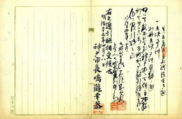 1896年4月1日、神戸市は兵庫県八部郡の一部である、湊村・池田村・林田村を編入しました。これは、兵庫県の郡の再編にあわせて行われたもので、市会への合併の諮問も県知事によって行われました。諮問の理由には、人口が増加している神戸市域の拡大を必要としたことや、湊川付替えで流路になる地域を神戸市に合併することが示されました。