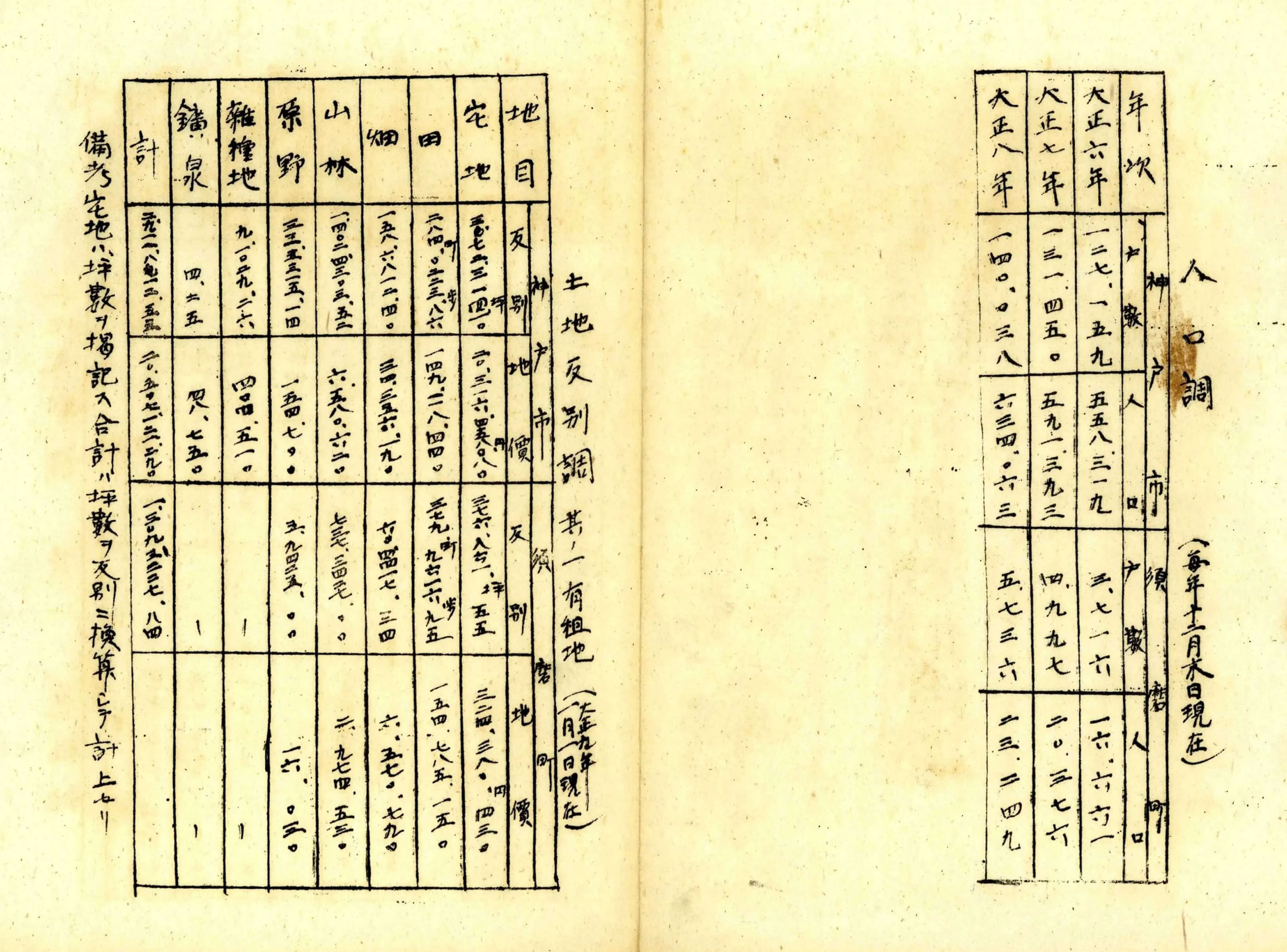須磨町との合併を見据えて神戸市が作成した、神戸市と須磨町の人口や土地反別などの比較表です。この表を見れば、合併によって何がどれだけ増えるか一目でわかります。