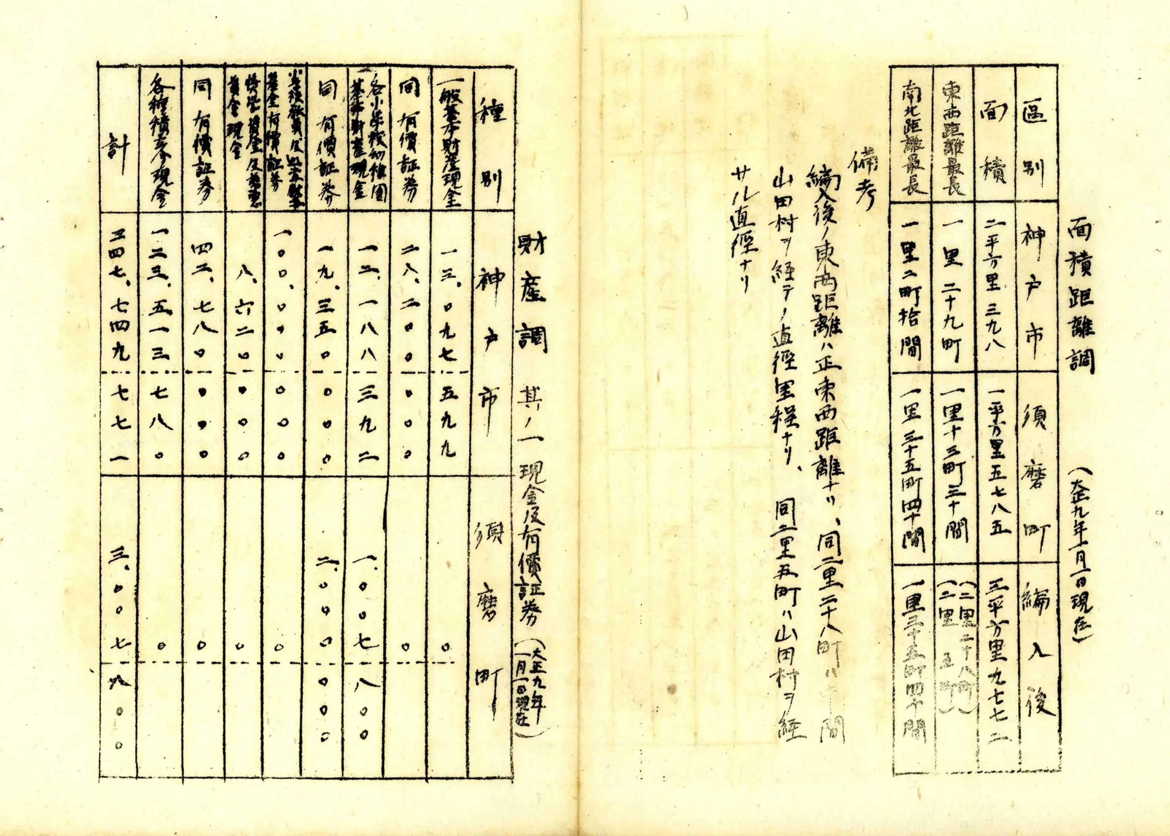 須磨町との合併を見据えて神戸市が作成した、神戸市と須磨町の人口や土地反別などの比較表です。この表を見れば、合併によって何がどれだけ増えるか一目でわかります。