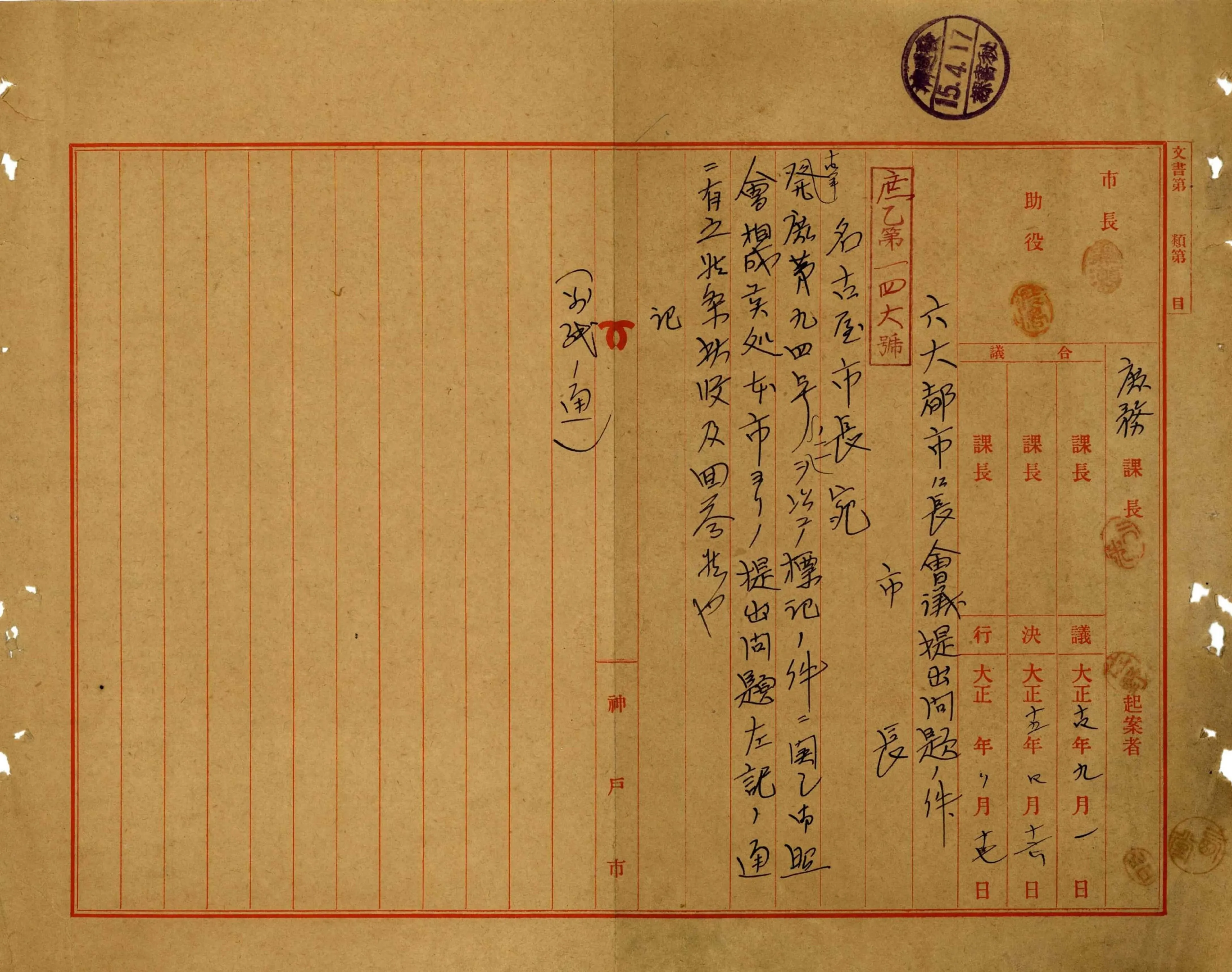 当時の六大都市(東京・横浜・名古屋・京都・大阪・神戸)は特別市制の実現に向けて協力し、協議の場として六大都市市長会議を開催していました。この資料は、会議で議題となる「提出問題」で、神戸市がどのような問題提起をしているのか知ることができます。