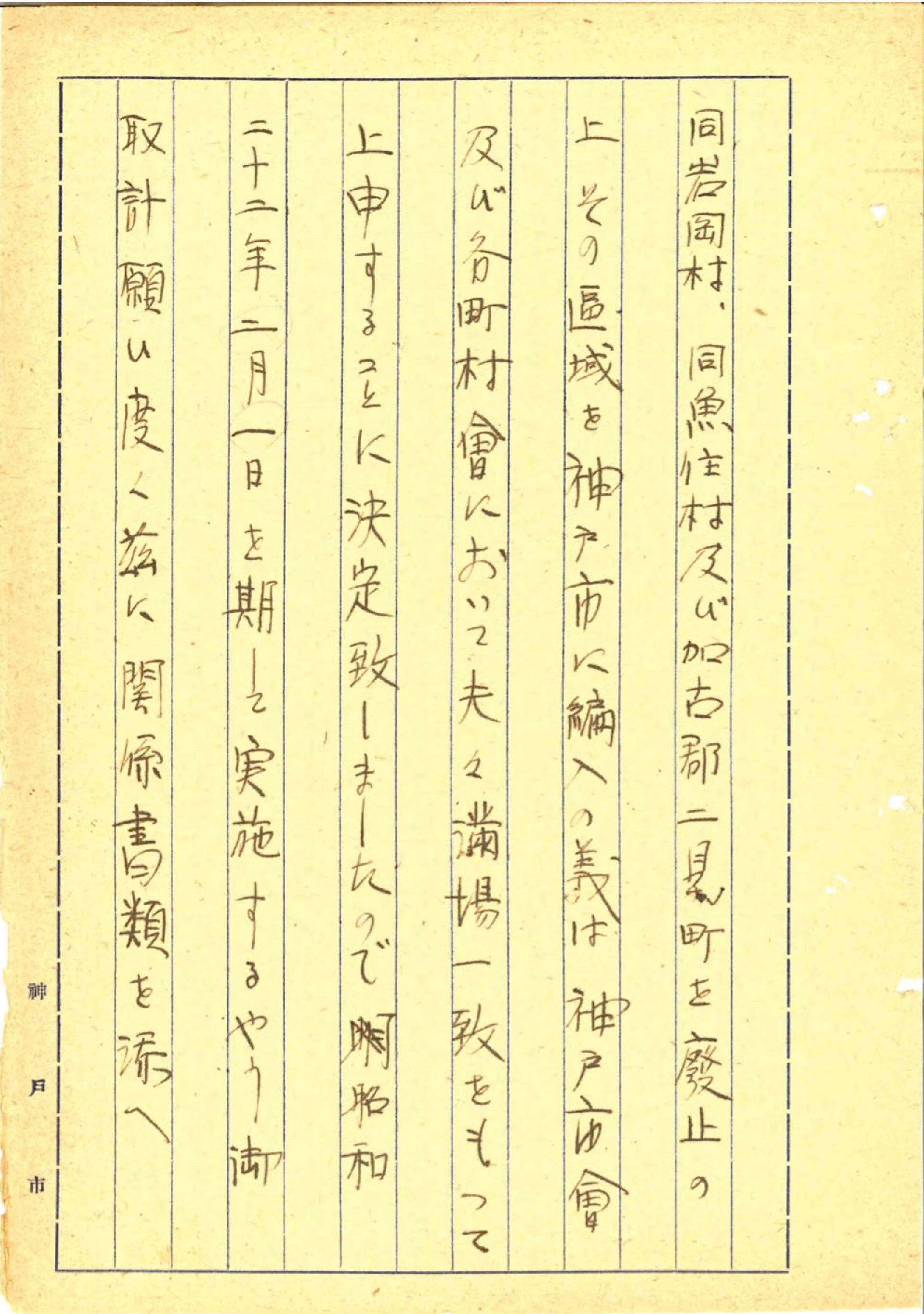 神戸市および合併予定の13町村が連名で、兵庫県知事に合併の実施を求めている文書です。実際に合併したのは10ヶ村ですが、当初は明石市に接する3町村(大久保町、魚住村、二見町)も合併する予定でした。しかし、これを受けた兵庫県知事は、3町村は明石の門戸に位置していて明石市と切り離すことは不適当であることから、10ヶ村のみ合併するべきとの判断をしました。それぞれの町村会で満場一致の合意を得ていたにもかかわらず、3町村が合併されなかったことは神戸市としても残念であったようで、懸案となった明石市との合併を模索していくことになります。