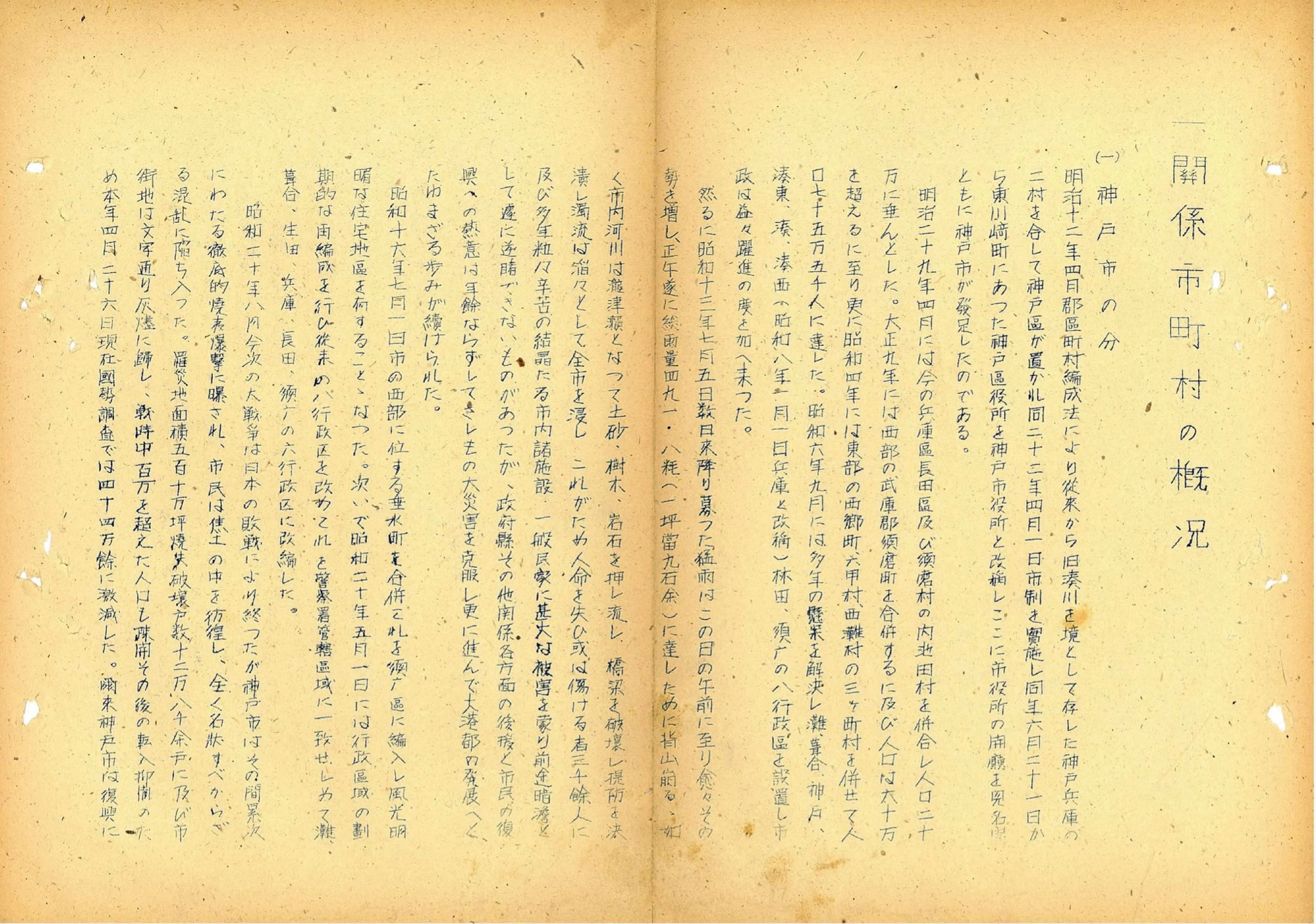 神戸市および合併予定の13町村の概況をまとめた文書です。作成されたのは合併前ですが、合併後に加筆された跡があります。神戸市の項目の末尾には鉛筆で「更に昭和二十二年三月一日有馬郡有馬町外九ヶ村を合併し面積は旧市域の三倍半となり、貿易再開と共に港はにぎわい、我が国第一の国際貿易都市として面目躍如たるものがある」と追記されています。合併が戦災復興と港湾都市としての発展のために行われたことがわかる一文です。ほかにも、二見町にはありませんが、合併されなかった大久保村と魚住村には×印が付けられています。