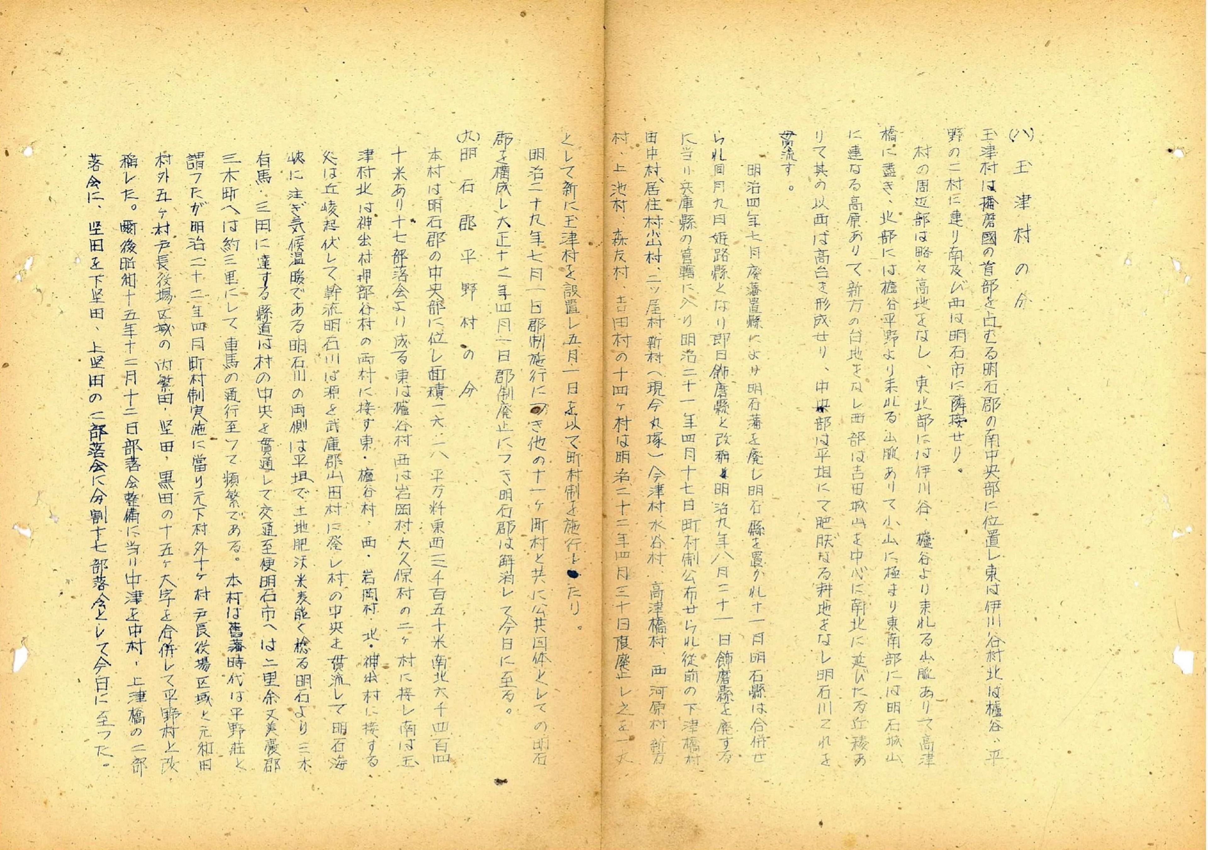 神戸市および合併予定の13町村の概況をまとめた文書です。作成されたのは合併前ですが、合併後に加筆された跡があります。神戸市の項目の末尾には鉛筆で「更に昭和二十二年三月一日有馬郡有馬町外九ヶ村を合併し面積は旧市域の三倍半となり、貿易再開と共に港はにぎわい、我が国第一の国際貿易都市として面目躍如たるものがある」と追記されています。合併が戦災復興と港湾都市としての発展のために行われたことがわかる一文です。ほかにも、二見町にはありませんが、合併されなかった大久保村と魚住村には×印が付けられています。