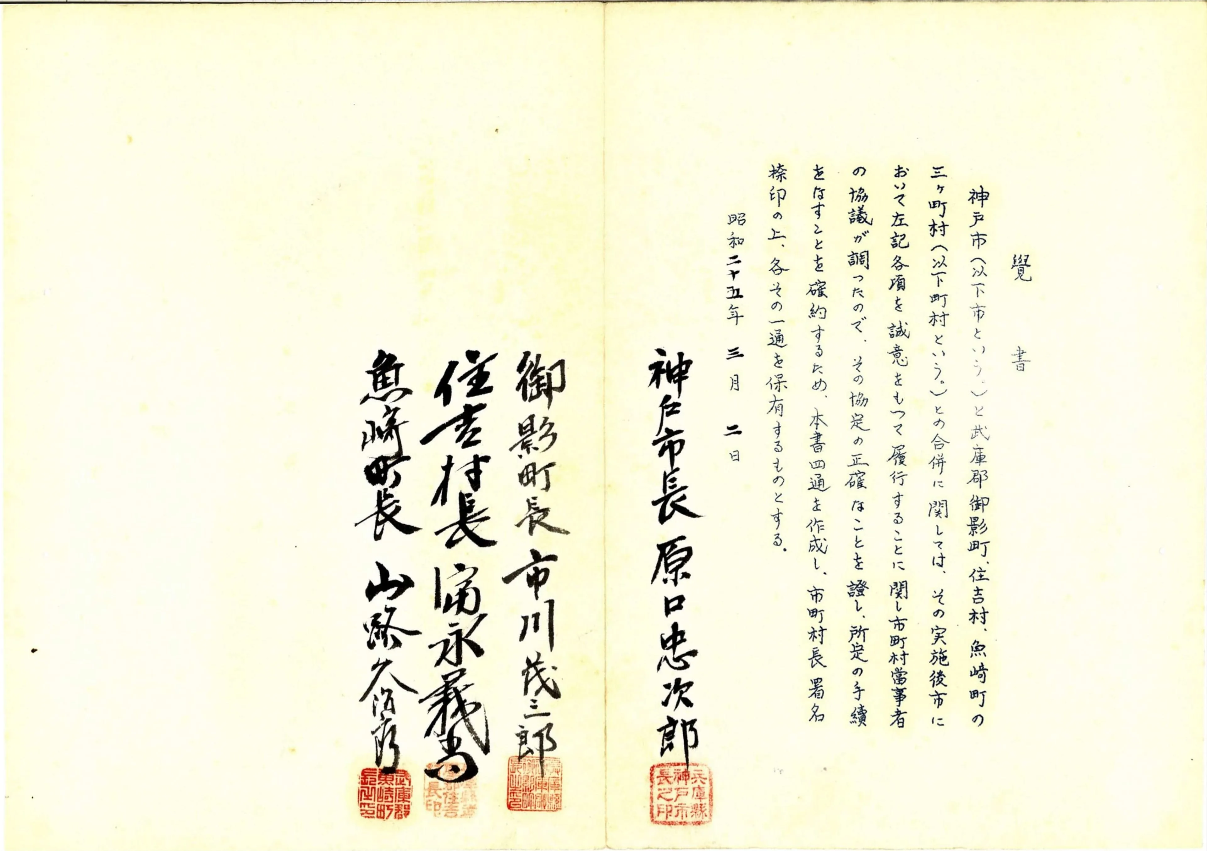 3ヶ町村の合併後に実施する事項について、第12代・原口市長と3ヶ町村の長が交わした覚書です。行政区の設置や町村職員を引き続き市において採用すること、住民の負担を重くしないことなどが挙げられています。なかでも、この地域らしい条件に「灘銘酒の醸造の向上発展に資する施設を設けるとともに、これを阻害するような施設をしないよう措置すること」があります。合併によって地域の産業やアイデンティティを失わないことを意識していたことがわかります。