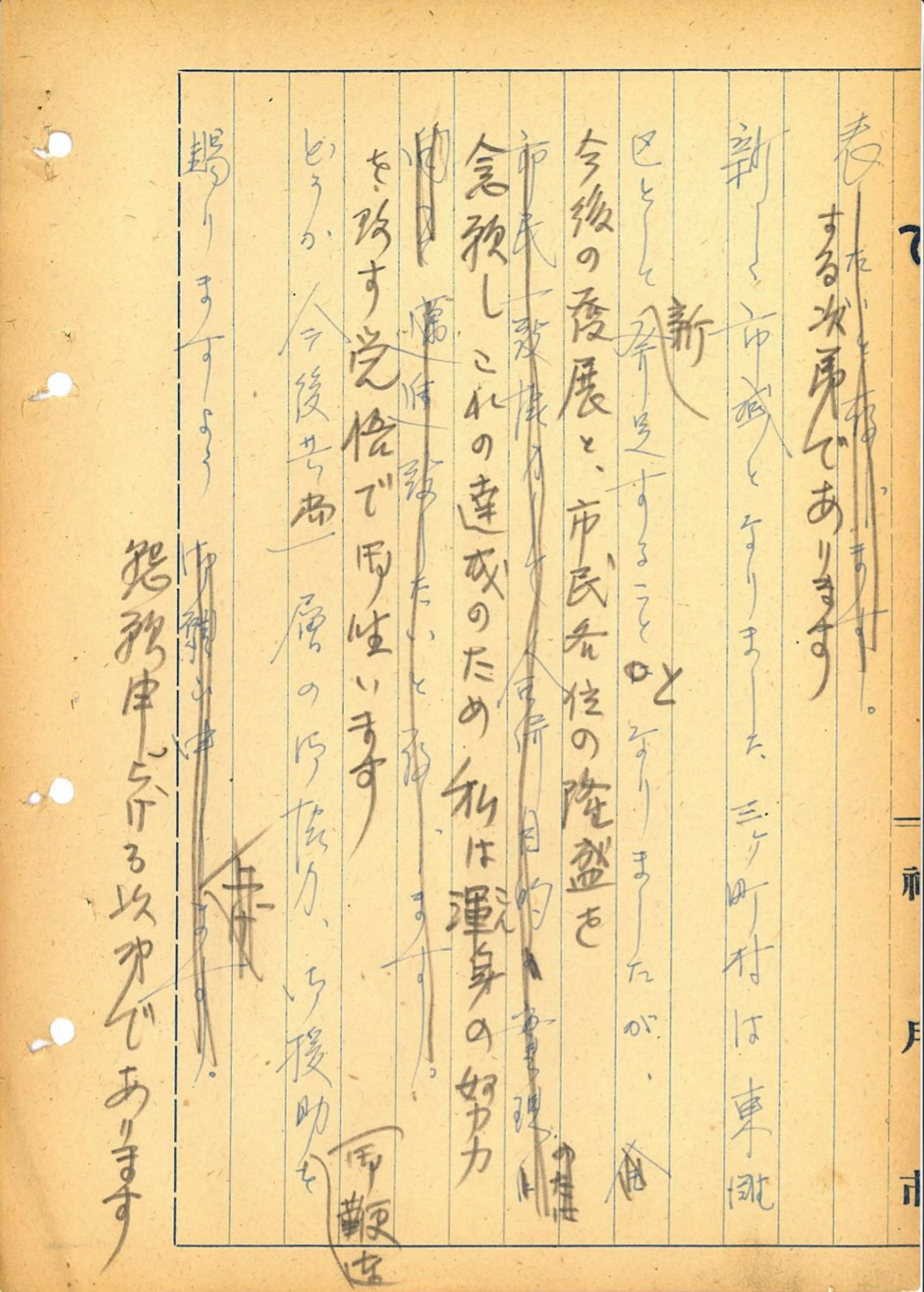 1950年4月13日に行われる合併記念の祝賀式で、原口市長が読み上げる祝辞の案文です。3ヵ町村の合併が、「大港都建設」のために必要なことであり、大正11年に東部5ヶ町村を神戸市都市計画区域に指定して以来の悲願であったことがうかがえます。残る2ヶ村(本山村、本庄村)の合併は持ち越されましたが、「貿易産業地域」形成への一歩であったことがわかる内容です。