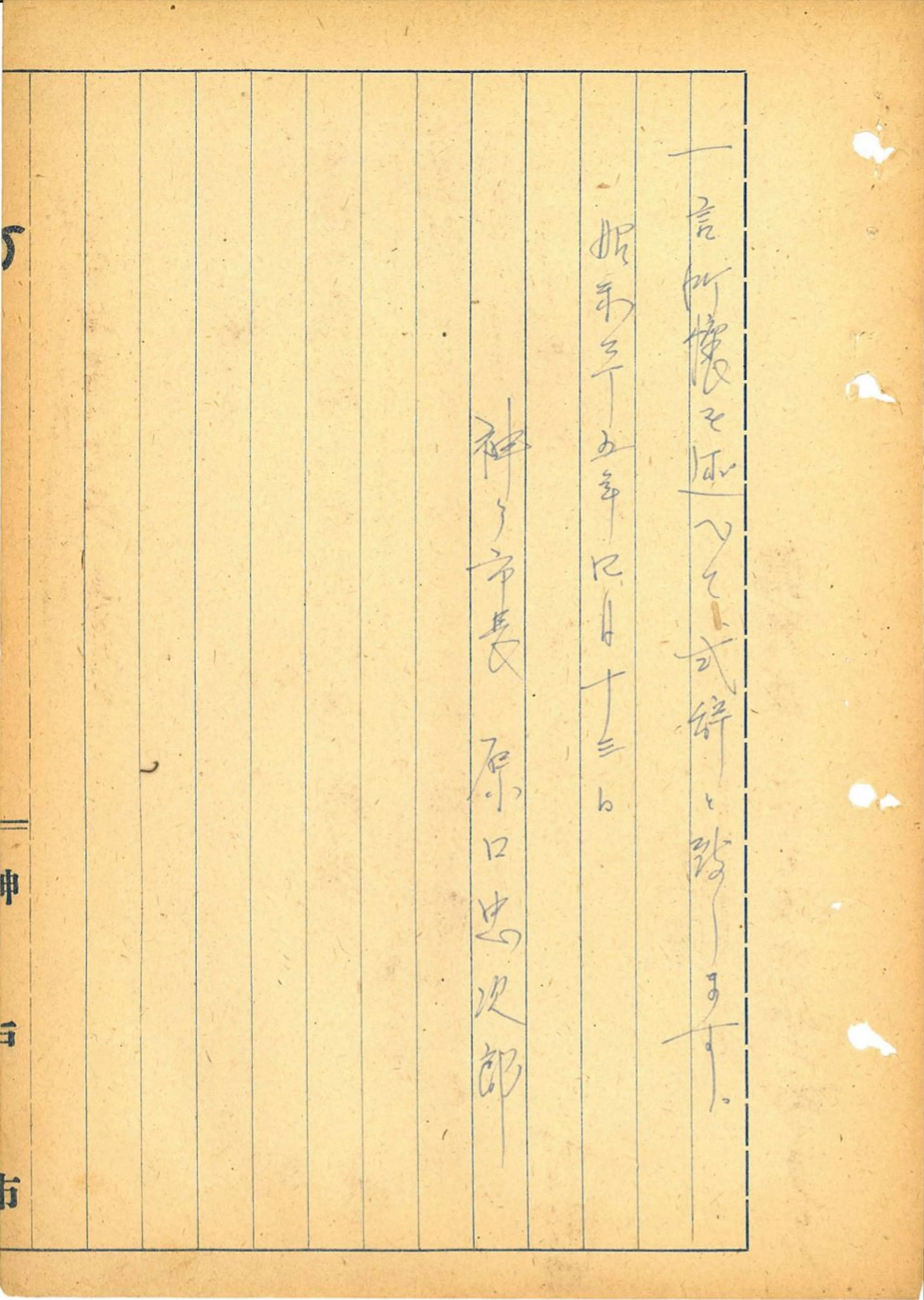 1950年4月13日に行われる合併記念の祝賀式で、原口市長が読み上げる祝辞の案文です。3ヵ町村の合併が、「大港都建設」のために必要なことであり、大正11年に東部5ヶ町村を神戸市都市計画区域に指定して以来の悲願であったことがうかがえます。残る2ヶ村(本山村、本庄村)の合併は持ち越されましたが、「貿易産業地域」形成への一歩であったことがわかる内容です。