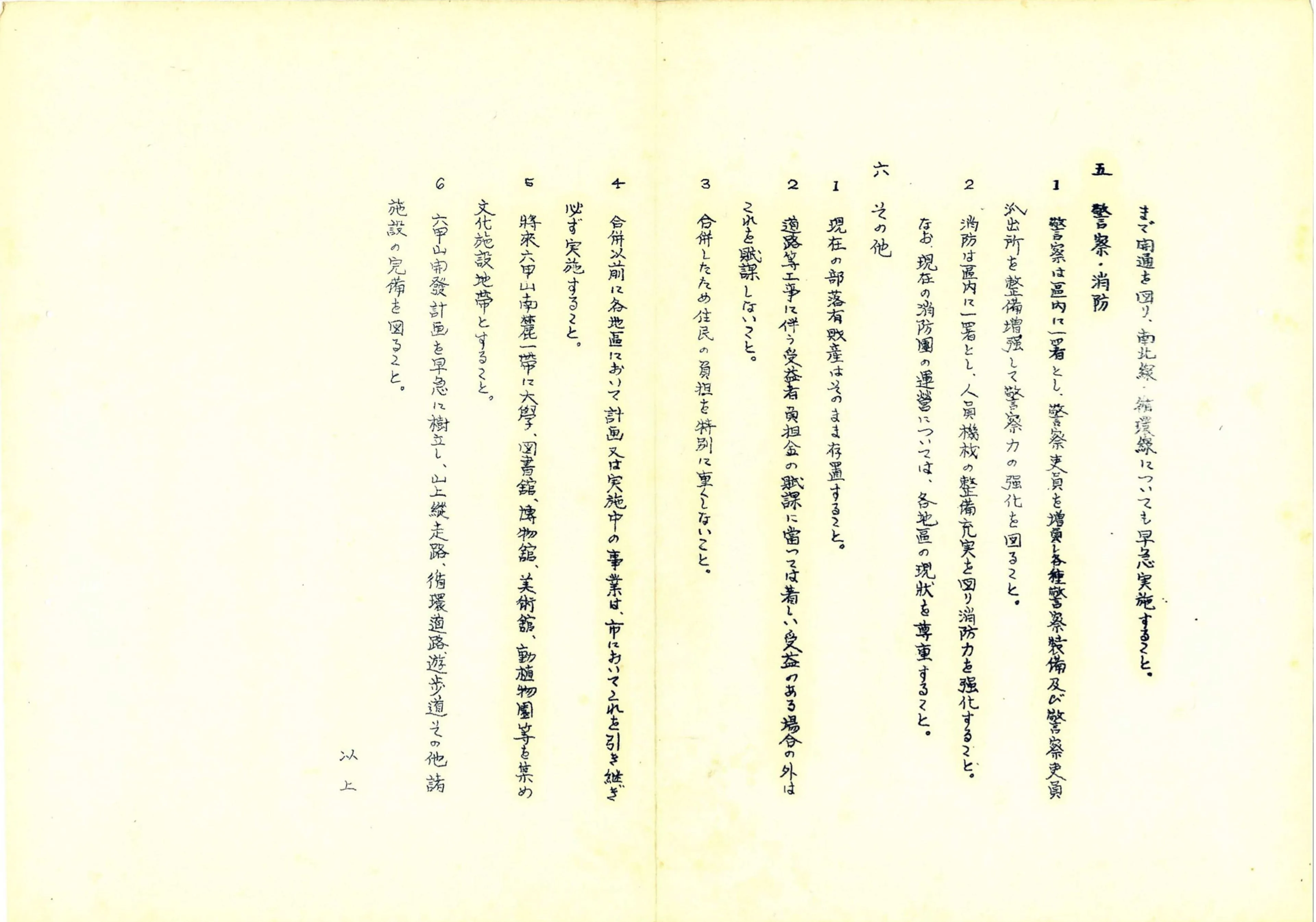 3ヶ町村の合併後に実施する事項について、第12代・原口市長と3ヶ町村の長が交わした覚書です。行政区の設置や町村職員を引き続き市において採用すること、住民の負担を重くしないことなどが挙げられています。なかでも、この地域らしい条件に「灘銘酒の醸造の向上発展に資する施設を設けるとともに、これを阻害するような施設をしないよう措置すること」があります。合併によって地域の産業やアイデンティティを失わないことを意識していたことがわかります。