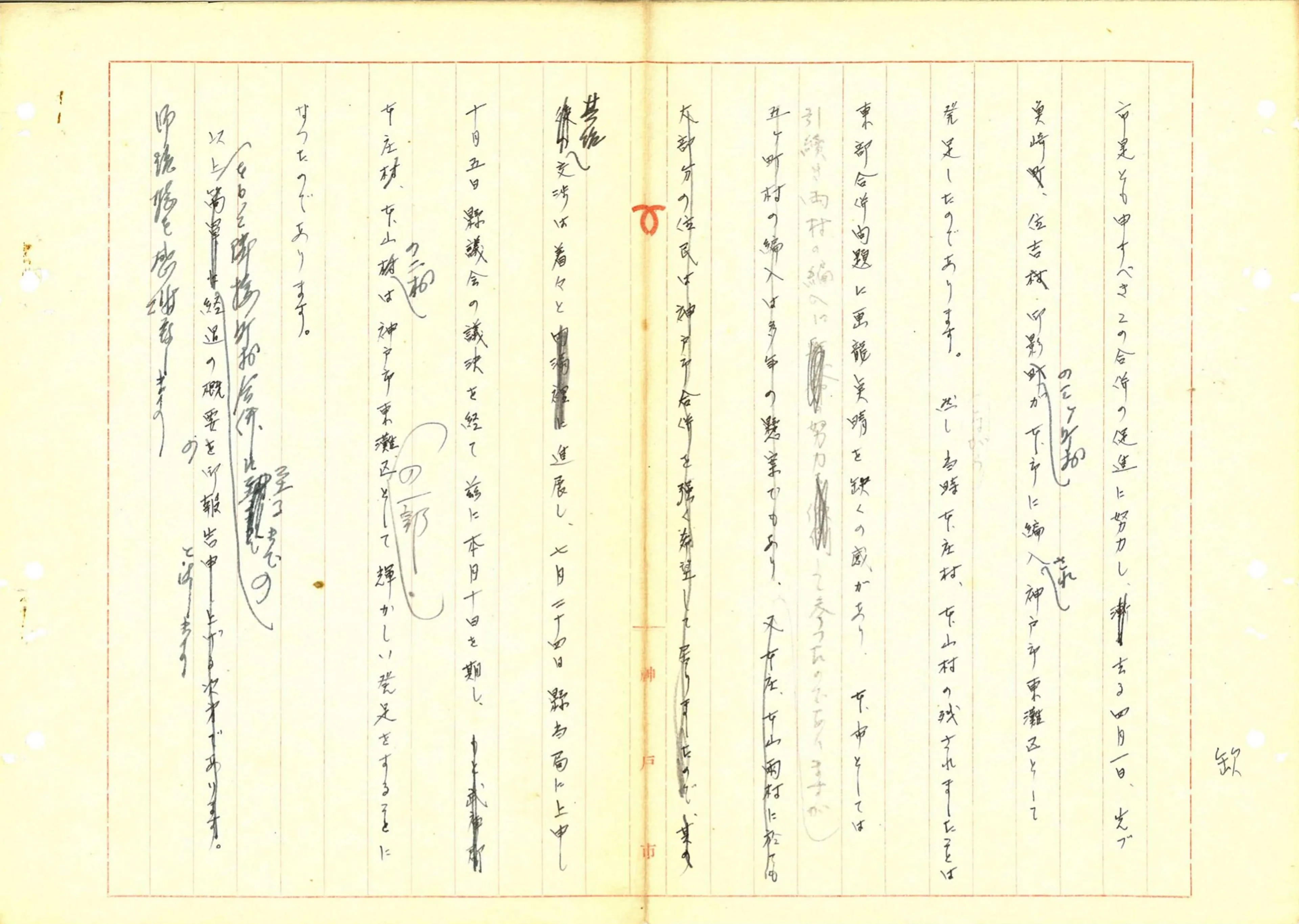 1950年10月19日決裁の文書で、同月21日に「みなとの祭」の記念祝賀にて神戸国際港都建設法制定と本庄村・本山村の合併の経過報告をしたいと伺いを立てています。神戸国際港都建設法は、神戸市を国際港都として発展させ、貿易・海運・観光の振興をつうじて日本の国際化と経済復興に貢献することを目的とした法律です。この法律の目的を達成するためには、本山村・本庄村の合併によって、東部を「総合一体化」して、港湾の背後地を盤石にする必要がありました。港都建設と合併は表裏一体であったことがわかります。