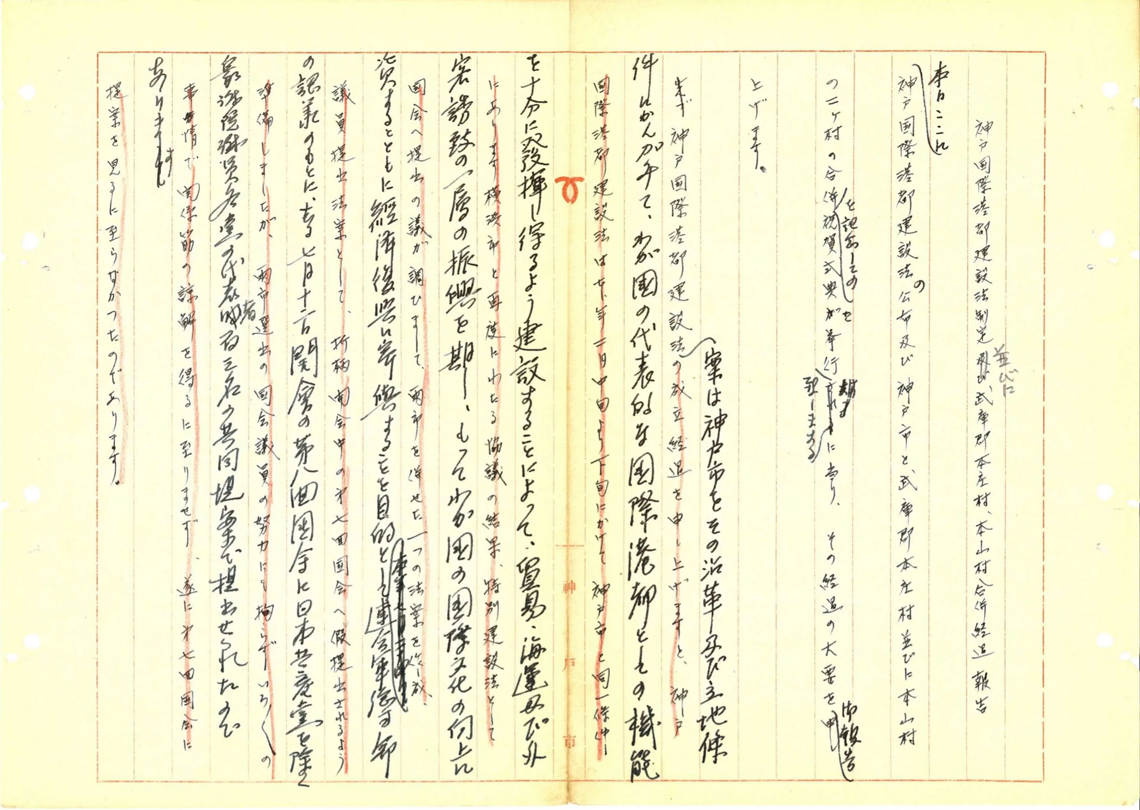 1950年10月19日決裁の文書で、同月21日に「みなとの祭」の記念祝賀にて神戸国際港都建設法制定と本庄村・本山村の合併の経過報告をしたいと伺いを立てています。神戸国際港都建設法は、神戸市を国際港都として発展させ、貿易・海運・観光の振興をつうじて日本の国際化と経済復興に貢献することを目的とした法律です。この法律の目的を達成するためには、本山村・本庄村の合併によって、東部を「総合一体化」して、港湾の背後地を盤石にする必要がありました。港都建設と合併は表裏一体であったことがわかります。