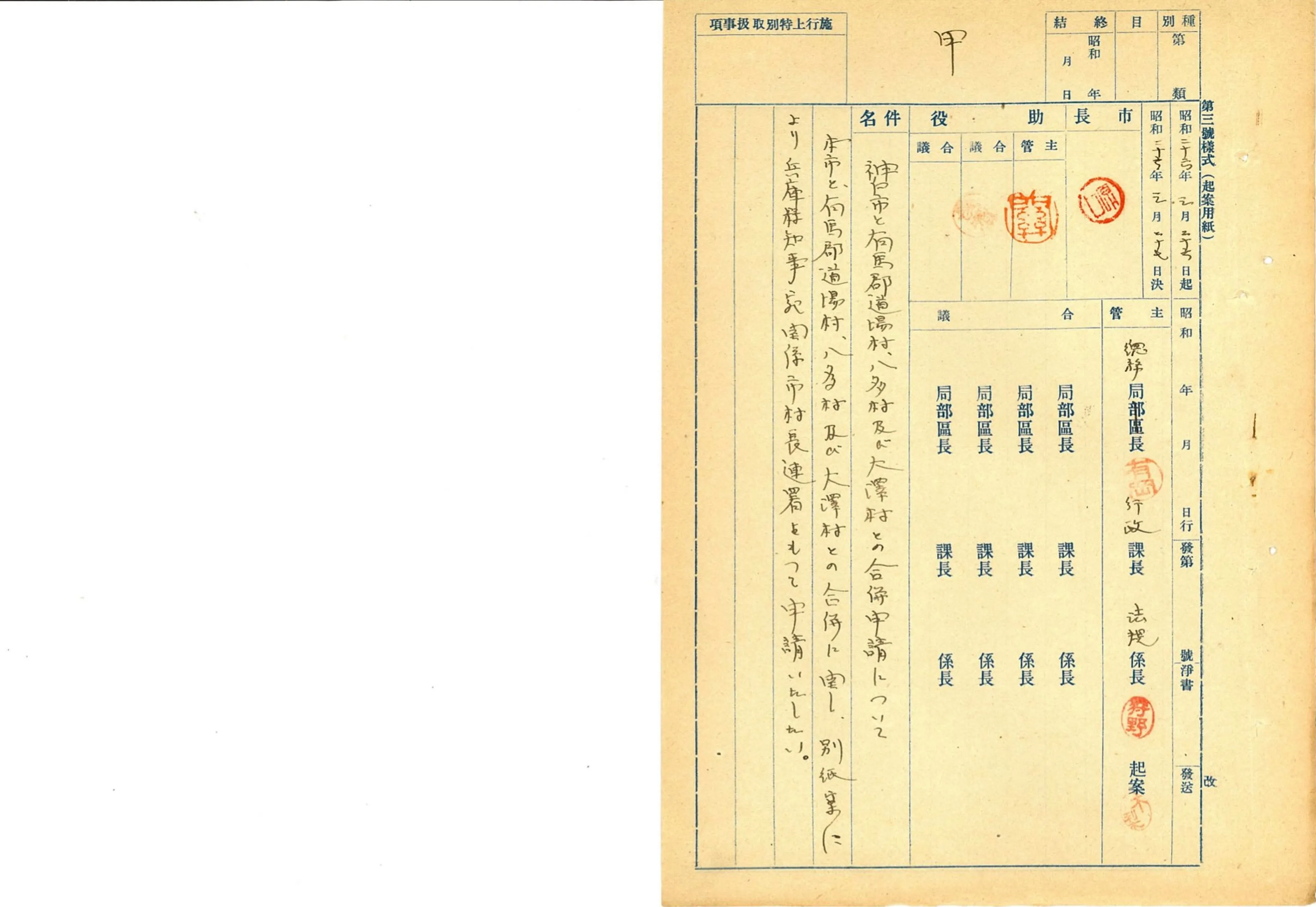 合併調印式の伺い文と同時に、兵庫県知事への合併申請の伺い文も作成されました。申請書には「昭和二十六年五月一日を期して」合併を実施するよう求めていますが、実際に合併されたのはその2か月後の7月でした。理由ははっきりしせんが、合併にあたっての県の調査が長引いたと考えられます。