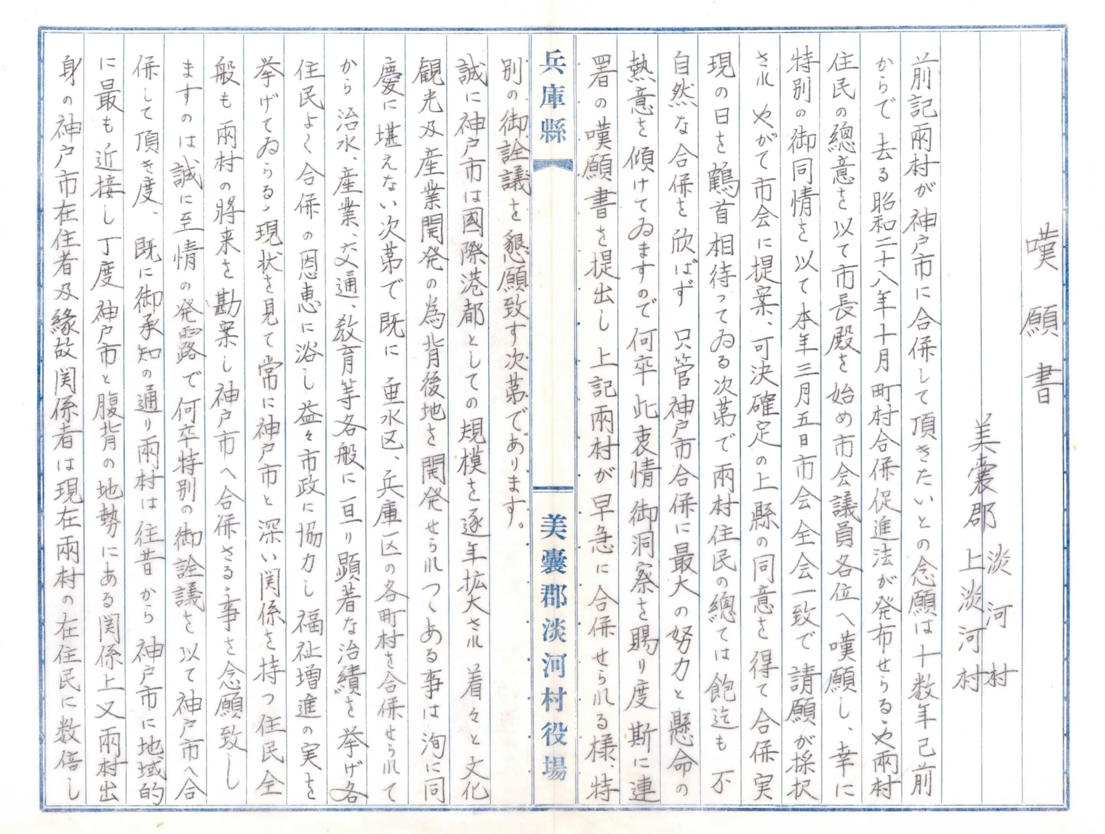 1955年10月17日、淡河村と上淡河村が第13代・原口市長に提出した合併の嘆願書です。長尾村合併の2日後に出されていることからは、北部合併の流れに乗りたい意図が垣間見えます。また、神戸市が港湾の背後地を必要としていることを理解したうえで、産業・文化・交通・労働・水利において神戸市にメリットがあるとしています。この2つの淡河村は、1957年7月に合併して新しい淡河村になり、神戸市への合併に向けて動きを加速することになります。