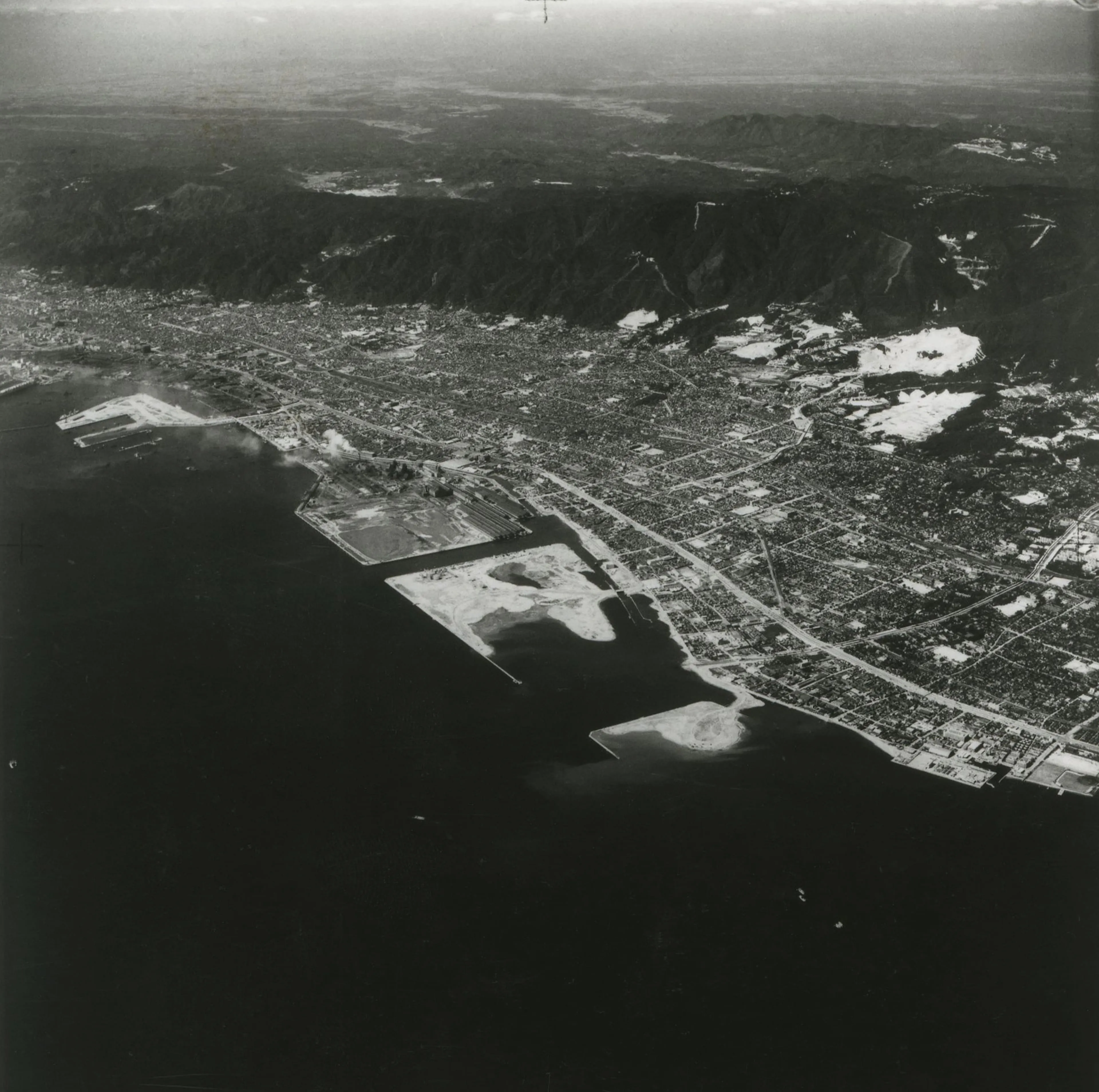 東部第2・3工区の海面埋立ての様子です。白くなっている箇所が工事中の場所です。写真中央の第2工区は形ができはじめていますが、第3工区はほとんどできていないようです。また、やや右上にも白くなった土地を確認できます。これは鶴甲山(奥)と渦森山(手前)で、この場所には後に団地が造成されます。山を削りながら団地を造成し、採取した土で東部海面を埋立てていたことがわかります。