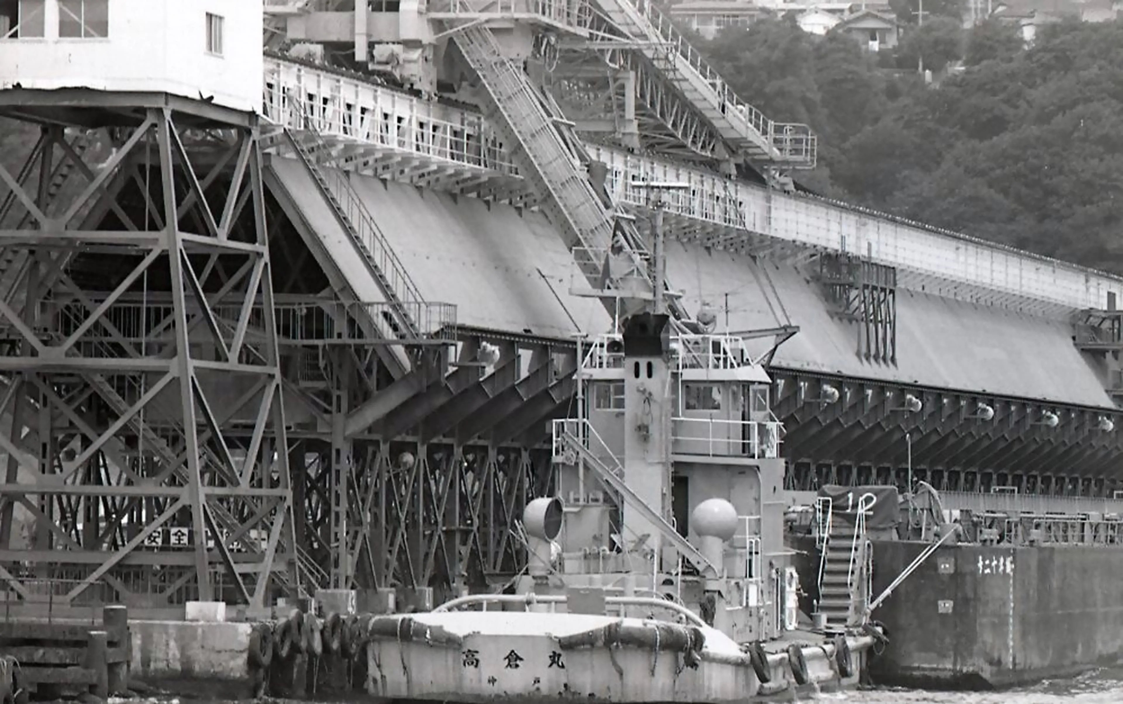 高倉山から須磨海岸にベルトコンベアで運ばれた土砂は、コンベア南端の船積み桟橋で船に移されました。写真は桟橋に横付けしている船の様子をとらえたものです。