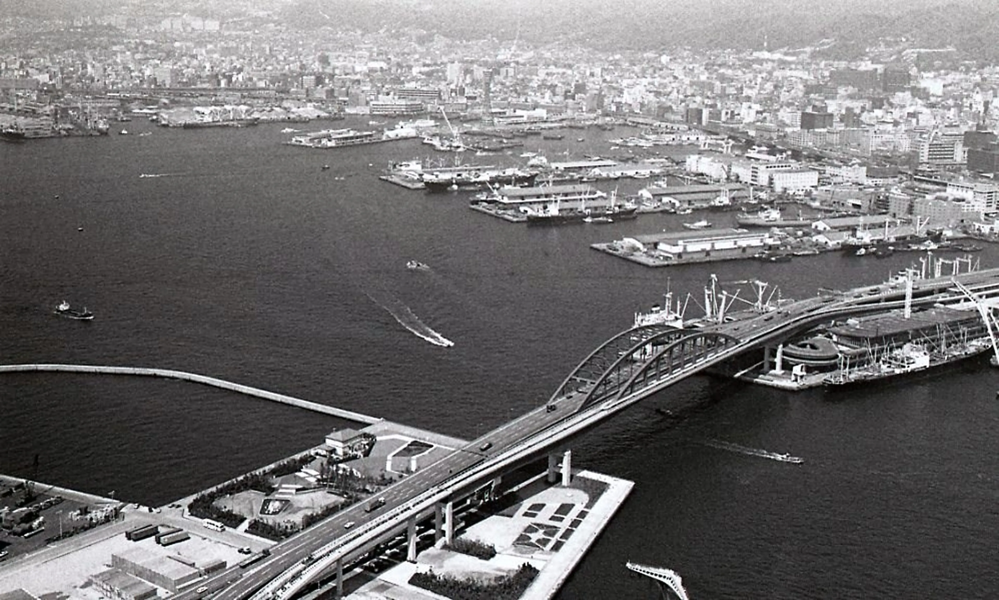 1970年に開業した神戸大橋は、新港第4突堤とポートアイランドを結ぶ日本初のダブルデッキアーチ型鋼橋です。2階層になっている橋で、上層が三宮方面行き、下層がポートアイランド行きの一方通行になっています。写真奥には新港突堤やポートタワーが見えます。